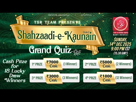 🔗 Grand Quiz Ki Registration Link: https://account.thestrongrope.com/login.php ⭐SHAHZAADI-E-KAUNAIN (S.A.) GRAND QUIZ⭐ 🏆 LIVE QUIZ | 1️⃣8️⃣ LUCKY DRAW WINNERS 🗓 Sunday, 14-Dec-2025 🇮🇳 9:00 PM IST 🇬🇧 15:30 GMT ► Quiz mein shaamil honay ka tareeqa: 1. Program 9:00 PM IST | 15:30 GMT shuru hoga Insha Allah 2. Program ghaur se dekhein taa ke Quiz mein pooche gaye sawaalon ke sahih jawaab de sakein 3. Quiz ki link Program ke shuru hote hi Live ho jaayegi 4. Program ke fauran baad Computerised Lucky Draw ke zariye winners ka ailaan hoga Insha Allah 🔜 Mazeed Maloomaat aur Quiz ke Qawaneen Ke liye hamare YouTube Channel ko Subscribe karein aur 🔔 Bell icon dabayein ➡️ https://www.youtube.com/c/TheStrongRope 🔔 Notifications ke liye Bell icon dabayein 🤲🏻 Iltemaas e Dua 🤲🏻 📱Hum se judein: Telegram: https://t.me/TheStrongRope Website: https://thestrongrope.com/ YouTube: https://www.youtube.com/c/TheStrongRope Instagram: https://instagram.com/thestrongrope/ Facebook: https://facebook.com/TheStrongRope/ Twitter: https://twitter.com/_TheStrongRope?s=... #SHAHZAADI_E_KAUNAIN (s.a.) #FatimaZahra (s.a.) #grandquiz #TSRquiz #TheStrongRope (a.s.)